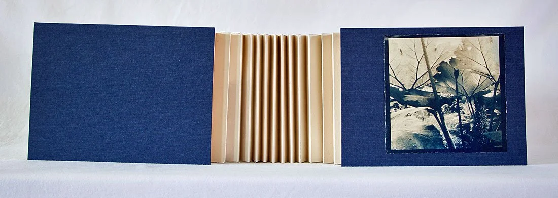 This is a compilation of white tea stained cyanotypes, in an accordion spine book format.