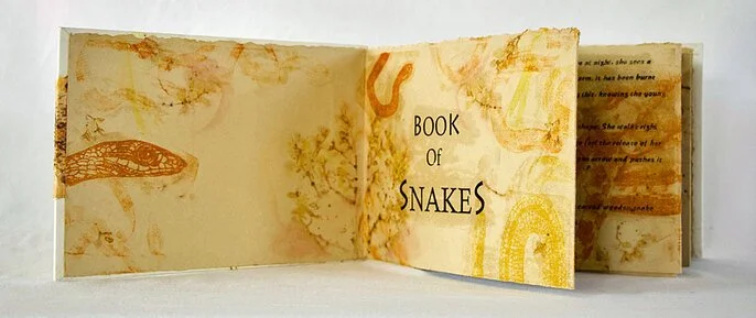 This book is a reflection of Snake as a repeated symbol within my dreamtime. These transformational and empowering dreams span many years, each with strong personal significance. I made Gum Arabic transfer prints of my photographs and drawings and hand dyed the paper with native plants. The cover is made with “road kill” snake skins that I prepared and preserved.